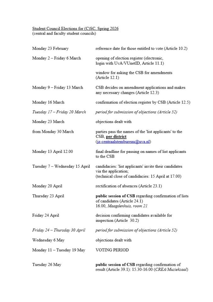 There is the Central Student Council (CSR) for the entire UvA. In addition, each faculty has its own Faculty Student Council (FSR). You are entitled to vote for the CSR and the FSR of the faculty or faculties where you study. This year, 11 parties are running in total, 6 of which for the CSR.